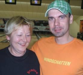 Ty získaly šest bodů a Jana Severová, rozená Hejkalová se stala druhým nejlepším hráčem dne. K tomu měla i nejvyšší nához mezi děvčaty (její synek Tomáš měl nejvyšší nához o den dřív), takže ji vidíte na první fotografii s majitelem nejvyššího náhozu lidí, Petrem Hrnčířem. Dračice měly i nejvyšší průměr družstev. Chaloupka team, který je třetí, na to šel jinak. S průměrem podstatně horším, než měly Dračice, skončil bez ztráty bodu. Mohlo by se zdát, že to bylo proto, že Chaloupky vyhrály na 456 bodů (na nižší výkon se body nebraly) o tři body a na 549 bodů o jeden. Já si však myslím, že se nahoře nemohli dívat, jak opora týmu Robert Šebek lomí rukama a těmi body tuto partičku obdarovali. Nejlepším z chaloupek byl tradičně Petr, který je druhým nejlepším hráčem ligy. Na druhé místo spadli, díky zisku čtyř bodů, Lahváči „B“. Na co jim byl druhý nejvyšší nához, když přesto dvakrát rupli, nevím. Jejich posila, Fanda Mrkos, je sice nelepším hráčem soutěže, ale tentokrát byl z družstva nejslabší. Na první místo se díky zisku šesti bodů dostal JaR. Je to, vzhledem k až šestému průměru dne, lichotivý zisk, ale historie se neptá. Nejlepším hráčem byla matka Gabriela před tchánem Lubošem. Manžel Radovan a dědek Zdenek se do první desítky ani nedostali. Na posledním místě a to je velké překvapení, jsou Kmotři. S úžasem jsem zjistil, že je tato informace nerozbrečí. Žijí teď v domnění, že jsou specialisty na baráže, takže pro ně je ligový ročník přípravou na jeden jediný den v roce. No, jen aby jim to vydrželo. Jinak ale hráli výborně, což nelze vyčíst ani ze zisku nula bodů, ani z toho, že měli nejnižší průměr. Dva body před nimi je VaK Jablonné, dříve Vodníci.