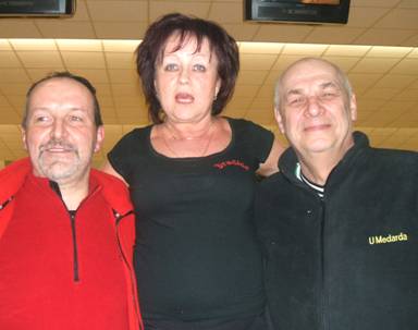 nejvyšší nához a proto je vyfocený na první fotce. Na focení si vzal mikinu s logem svého sponzora. V červeném je na obrázku Milan Veselý, partner ligy a mezi nimi je Jana Nováková, která výkonem 208 bodů měla nejvyšší nához žen. Čtrnáct bodů získal Odchov zvířat a ukázal, jak je nebezpečný. Ne ziskem bodů, to byla určitě náhoda, ale pojetím hry. Po utkání se sparingpartnerem (na volné dráze trénovali šestiligoví Chrousti) se dali do oslavování a já při představě, že Chrousti postoupí, Zvířata spadnou a sejdou se v páté lize, získal další šedivé vlasy. Zvířata ale asi nesestoupí, měla (Petr, Přéma a Petr) nejvyšší průměr družstev. Na šesté místo sestoupili Hujeros. Získali jen osm bodů, ale projevili taktickou vyzrálost. Na utkání bez soupeře postavili Míšu Venclovou. Prohrát se to utkání nedalo a oni získali další jméno do tomboly. Jsem zvědavý, zda jim to bude něco platné. Na páté místo postoupil Slabý odvar, po zisku třinácti bodů. Pátý nejlepší hráč ligy, Libor Čaban, byl tentokrát nejlepší, měl průměr 181,25 bodu. Tým měl třetí a čtvrtý nejvyšší nához družstev. Dračice zůstaly čtvrté, i když získaly jen devět bodů. Radost jim udělala již pochválená Jana Nováková a radost jim určitě udělalo vítězství 4 : 1 na výkon 449 bodů. To se jim podařil ve spolupráci s VoSami. Místo na stupních vítězů, mám na mysli nejnižší stupínek, si udržel i Chaloupka team. Chaloupky v mužské sestavě (Honza, Robert a Petr) vybojovali třináct bodů. To je vzhledem